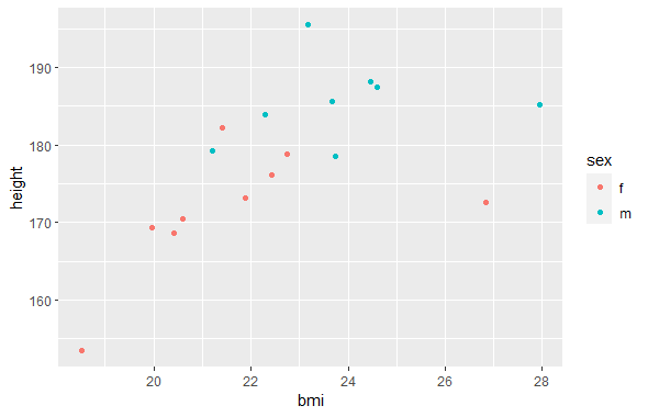 ggplot(df_by_sport, aes(x=bmi, y=height, color = sex)) + geom_point()
