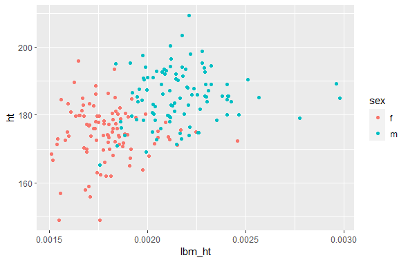 ggplot(df_mutated, aes(x=lbm_ht, y=ht, color = sex)) +