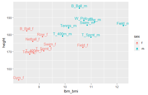df_by_sport_new <- df_mutated %>% group_by(sport, sex) %>% summarise(lbm_bmi = mean(lbm_per_height), height = mean(ht))
